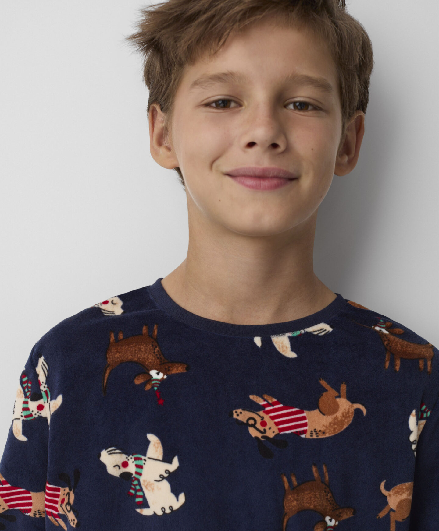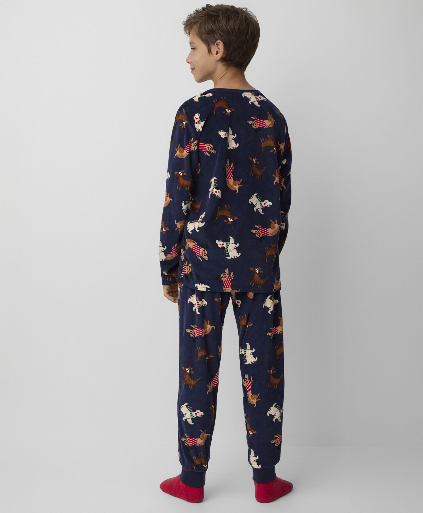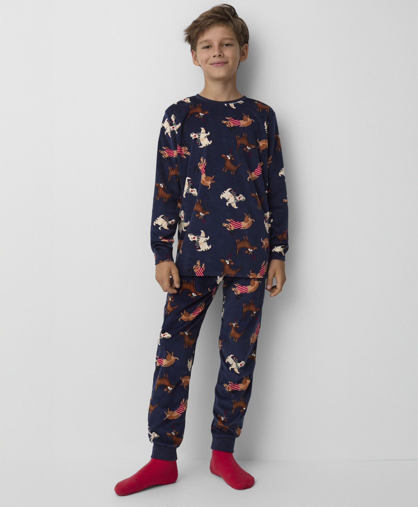 Кадифените пижами за момчета с мотив куче осигуряват комфортен сън и свобода на движение. Изработени от мек и приятен на допир кадифе, те са идеални за по-хладните нощи, гарантирайки топлина и уют. Закачливите шарки с кучешка тематика ще накарат всяко момче да се стреми да ги облече преди лягане.