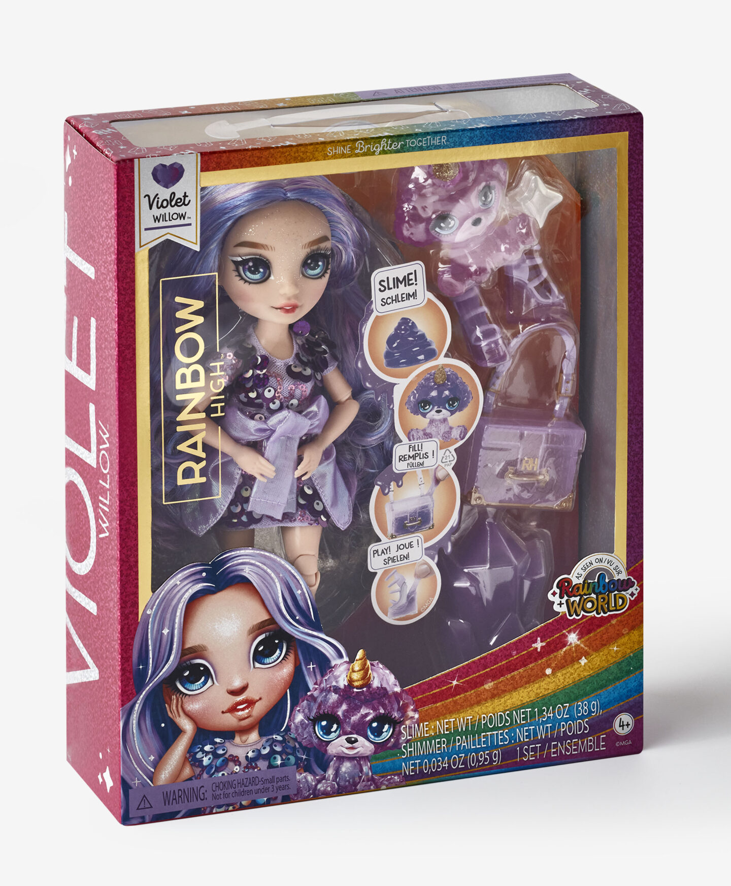 Куклата Rainbow High Violet Willow радва с наситени цветове и аксесоари, които разнообразяват играта. Дългата й коса в нюанси на лилаво се съчетава перфектно с роклята, украсена с флорален мотив. Комплектът включва обувки на висок ток, чанта, гребен и поставка, които дават възможност за разнообразни идеи по време на игра.