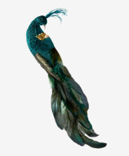 Голямата украса с паун в тюркоаз е ефектен акцент, който ще промени облика на коледната елха. Дълги пера, блещукащи в дълбоки, паунови цветове, придават феноменален характер на аранжировките. Това е украса, която веднага привлича вниманието, внасяйки частица екзотика и коледен блясък в интериора.