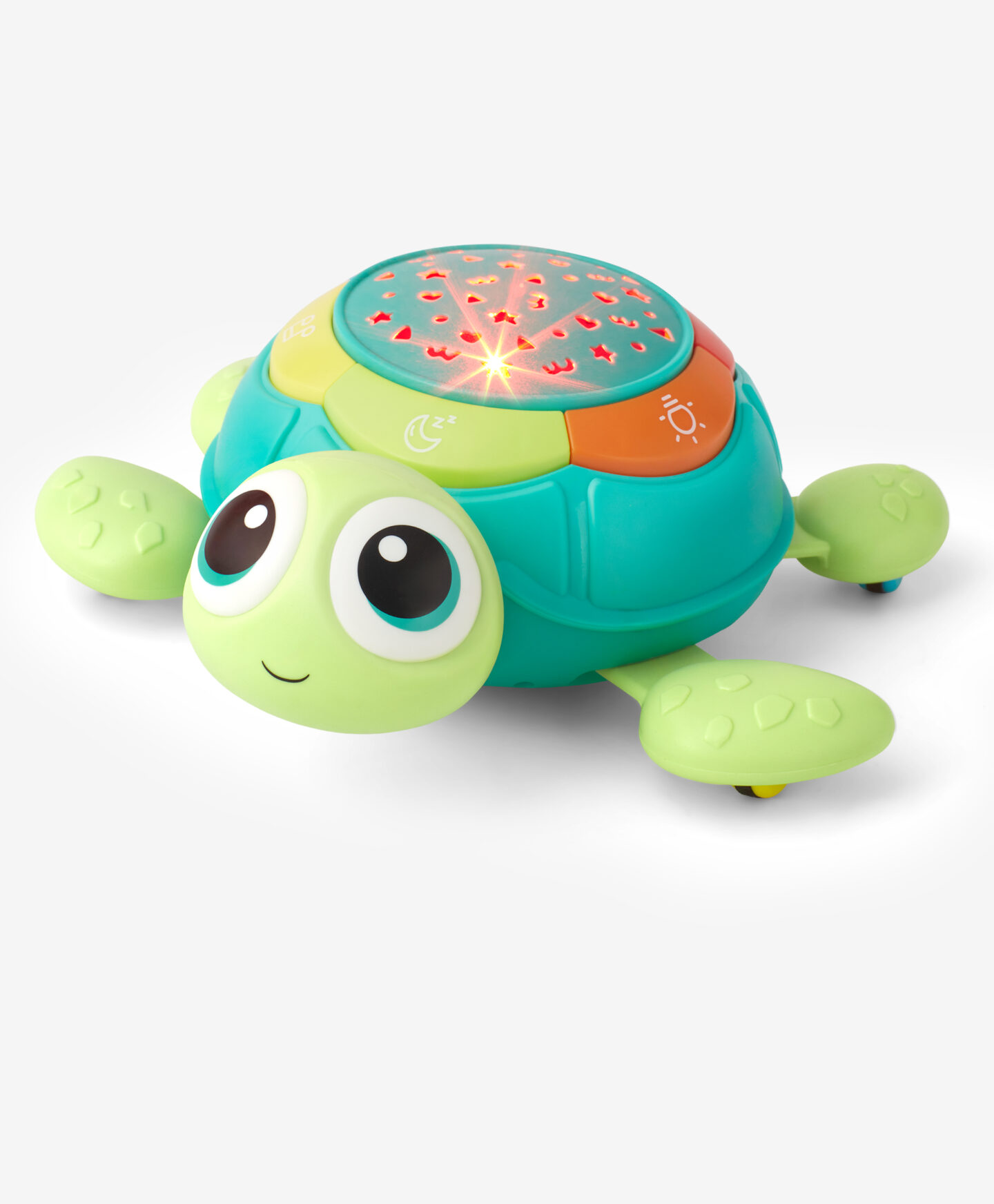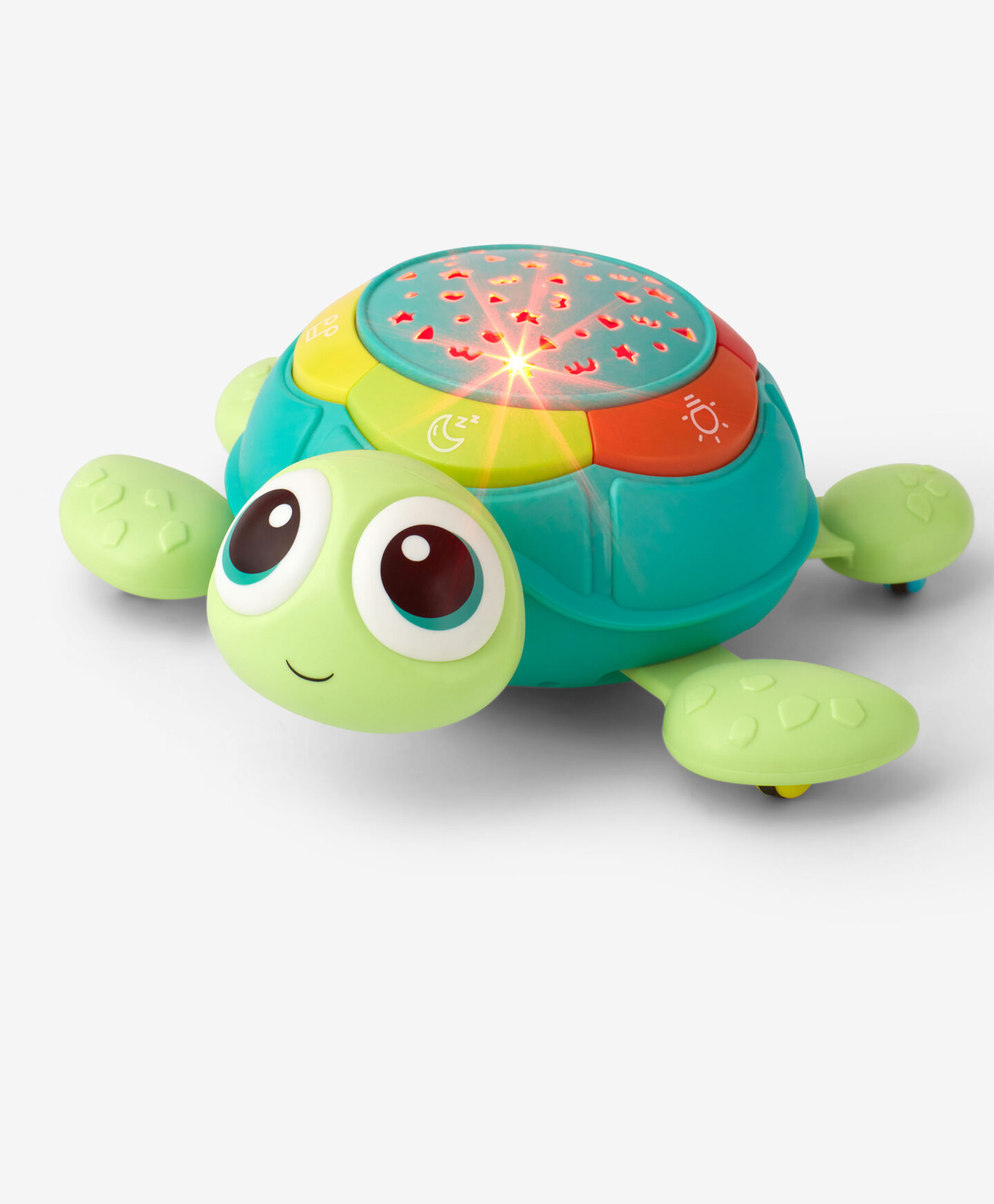 Проекторът за ходеща костенурка съчетава функцията на движеща се играчка с показване на светлинни ефекти. Докато играе, костенурката се движи напред и в същото време хвърля светлинни шарки, които привличат вниманието на детето. Играчката стимулира зрението и насърчава физическата активност. Включени батерии.