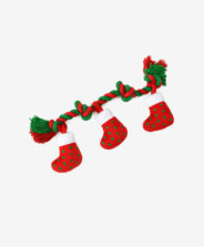Играчката за куче с чорапи се отличава с цветен дизайн и меки аксесоари под формата на червени чорапи. Здравото въже гарантира издръжливост, а плюшените елементи разнообразяват забавлението и насърчават хващането. Цветовете предизвикват празнично настроение, а кучето получава нещо за вършене, което осигурява упражнения и забавление.