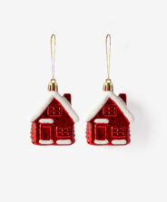 Висулките за коледно дърво във формата на къщи ще добавят празнична атмосфера към интериора. Комплект от две червени къщи с бели покриви приличат на заснежени къщички, които красиво отразяват светлината на лампите. Благодарение на солидна изработка и удобни висулки, те могат лесно да украсяват клонки, създавайки последователна, очарователна украса.