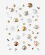 Комплект пластмасови играчки е елегантно предложение, което красиво ще допълни коледната украса. Комбинацията от бели и златни нюанси придава лекота и фин блясък, а разнообразните текстури правят всяка декорация уникална. Фенелките създават последователна композиция, която ще освети коледната елха и ще внесе романтична аура на Коледа в интериора.