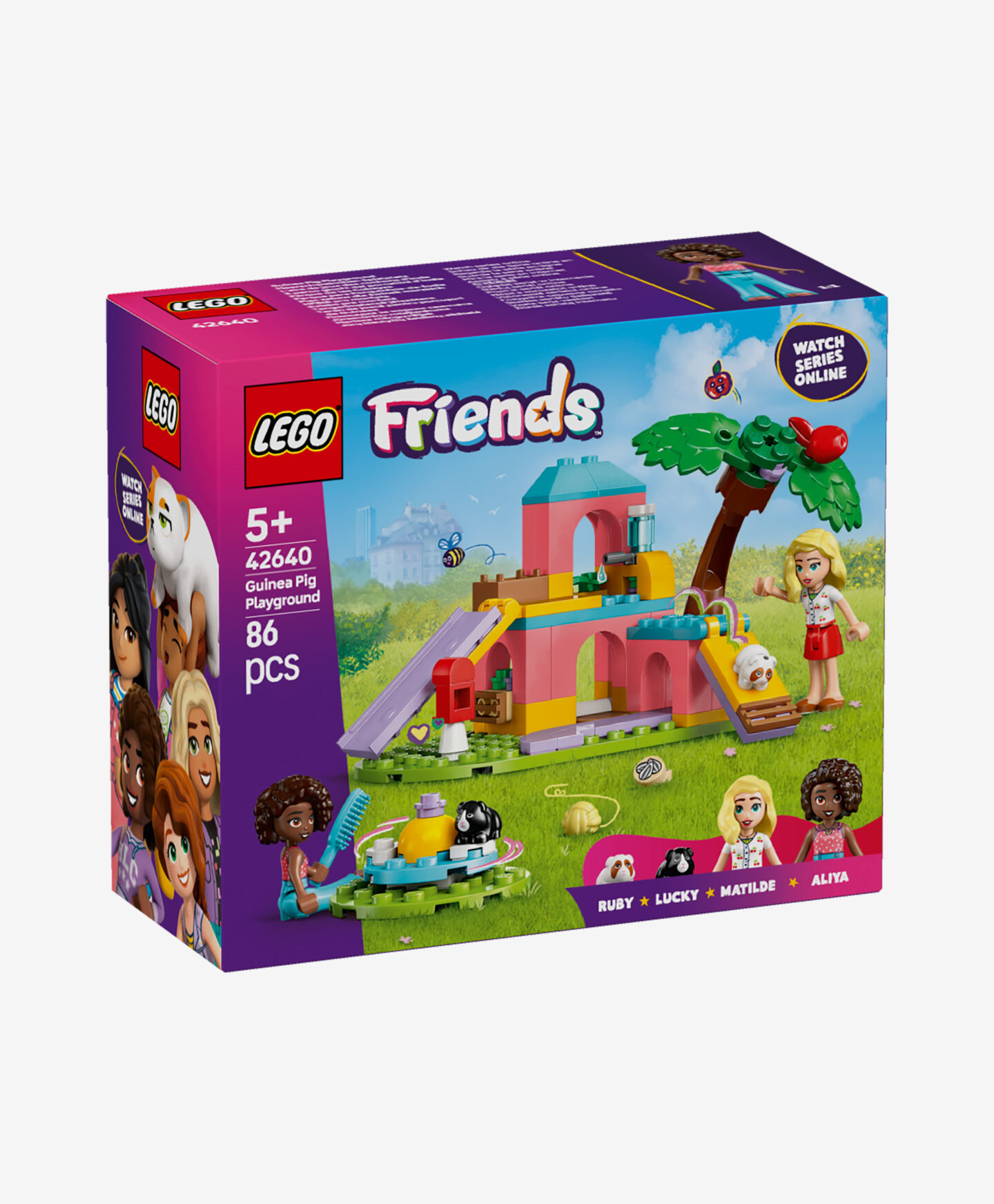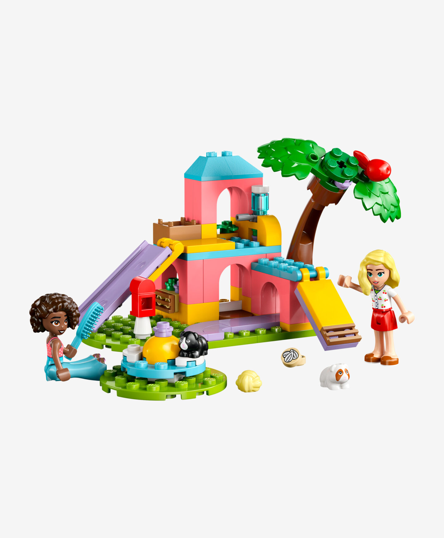 Детската площадка за морско свинче LEGO® Friends дава възможност на децата да се грижат за сладки животни. Комплектът включва цветна писта с препятствия, въртележка и аксесоари, които създават пространство, пълно с атракции за фигурите на морски свинчета.
